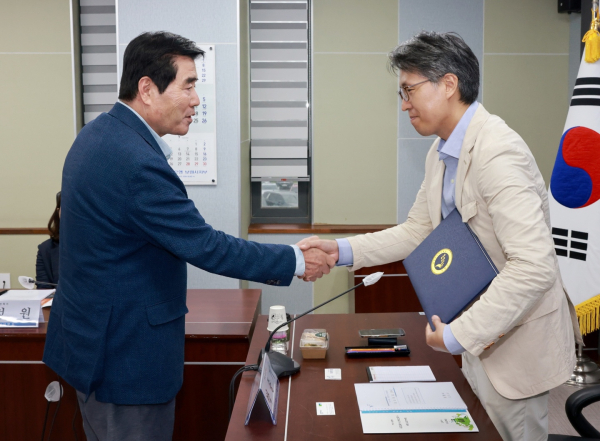 김동일 보령시장(왼쪽)이 박종기 교수에게 위촉장을 건네고 있다/순천향대 제공