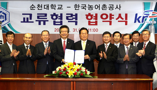 한국농어촌공사(사장 박재순)와 순천대학교(총장 송영무)가 31일 오전 농어촌 발전을 위한 기술 개발, 인력 양성 등을 위한 ‘교류협력 양해각서’를 체결했다.