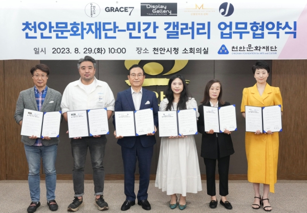 재단은 지난 29일 갤러리현, 그레이스세븐, 디스플레이 갤러리, 신불당아트센터, 제이갤러리 등 총 5개 민간 갤러리와 문화·예술 향유 기회 확대를 위한 업무협약을 체결했다.