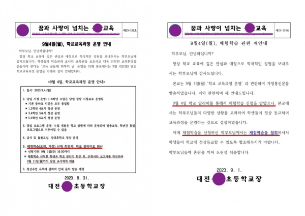 이를 두고 논란이 일자 교육청은 설명자료를 통해 “교육청이 9월 4일 교외체험학습을 불허했다는 보도는 사실과 다르다”며 “개별적이고 정상적으로 학생이 신청하는 교외체험학습의 경우 허용 가능하다”고 해명했다.