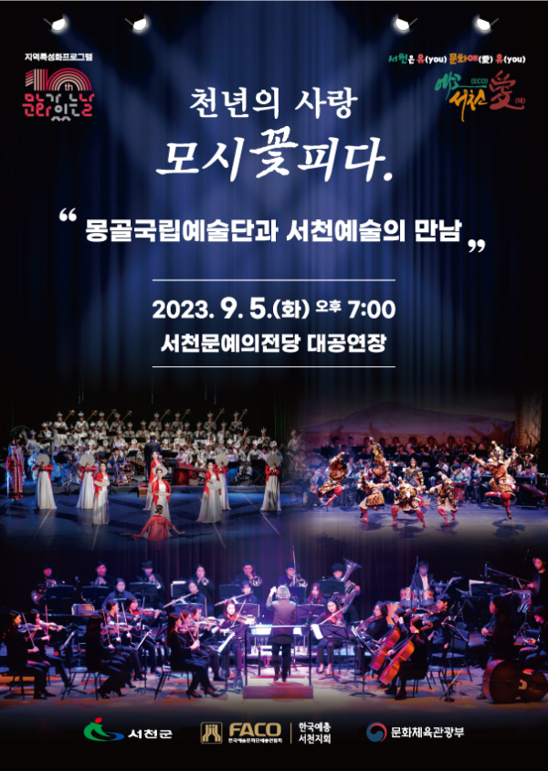[충청뉴스 서천 = 조홍기 기자] 서천군이 오는 5일 서천 문예의 전당에서 전통예술단 혼, 서천필하모닉오케스트라, 몽골국립예술단 등과 문화가 있는 날 ‘모시 꽃 피다’를 개최한다.