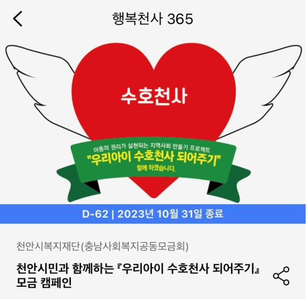 모금캠페인 참여는 천안사랑카드 앱 ‘행복천사 365’ 기부 서비스에서 ‘수호천사’를 선택하고 원하는 금액을 기부할 수 있다.