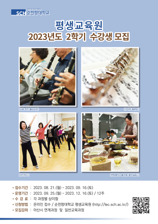 [충청뉴스 박동혁 기자] 순천향대학교 평생교육원은 2023학년도 2학기 수강생을 모집한다고 5일 밝혔다.