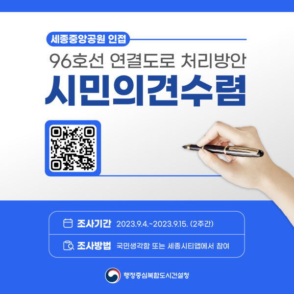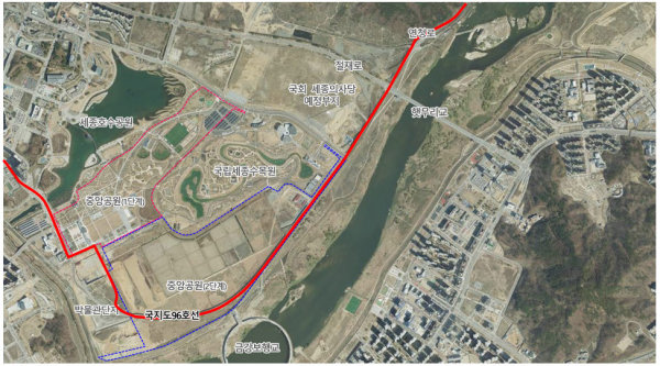 [충청뉴스 최형순 기자] 행정중심복합도시건설청(이하 행복청)은 세종중앙공원 인근 국가지원지방도 96호선 연결도로(이하 국지도 96호선) 처리방안을 마련하기 위해 2주간(9.4(월)~9.15(금)) 시민 의견수렴을 진행한다.