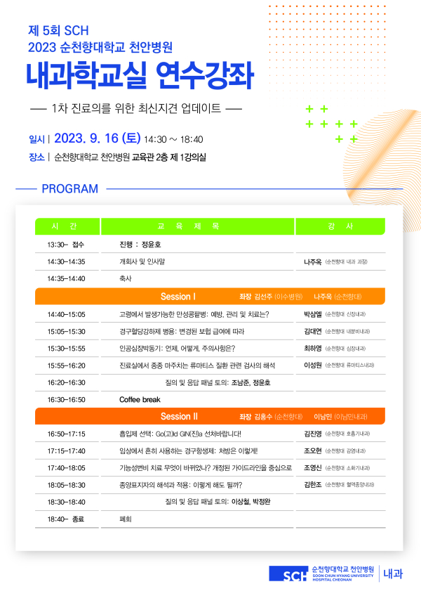 이번 강좌는 순천향대 천안병원 협력병원과 전공의, 군의관, 공중보건의는 무료로 참석할 수 있다. 그 외 개원의 및 봉직의들의 참가비는 사전등록 1만 원, 현장등록 2만 원이다.
