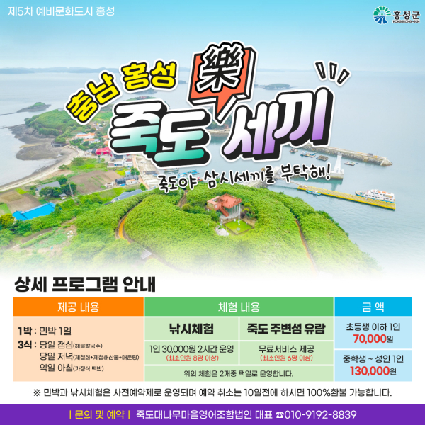 프로그램은 숙박 1박에 3끼(당일 점심, 당일 저녁, 익일 아침)을 초등학생 이하 7만 원, 중학생부터 성인은 13만 원에 제공하고, 낚시와 죽도 주변섬 유람 등의 체험활동까지 함께 제공하는 오감만족 여행을 선사한다.