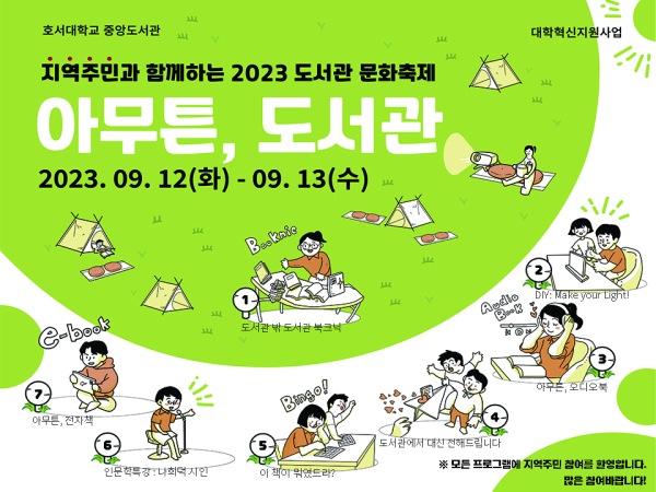 이번 축제의 주제는 ’아무튼, 도서관‘이다. 호서대 원형광장에서 '도서관 밖 도서관 북크닉’과 다양한 형태의 도서관 자료를 소개하고, 직접 체험할 수 있는 ‘아무튼, 전자책’, ‘아무튼 오디오북’ 등의 프로그램을 진행한다.