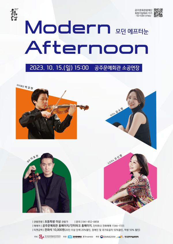 [충청뉴스 공주 = 조홍기 기자] (재)공주문화관광재단은 10월 15일 오후 3시 공주문예회관 소공연장에서 영앙상블의 ‘모던 에프터눈’ 공연을 진행한다.