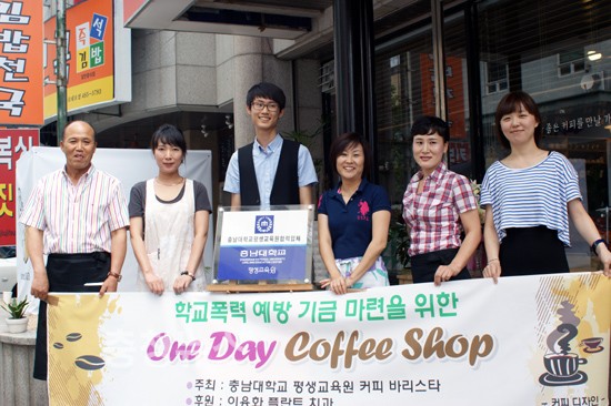 ▲ 학교폭력예방기금 마련을 위한 일일 찻집 행사 좌-권영복,박은아, 김윤, 이수미,오미숙,송기란 바리스타 수강생들이 자원봉사에 참여 했다.