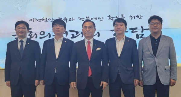 (왼쪽부터)이정문 의원, 박완주 의원, 박상돈 시장, 문진석 의원, 신동헌 부시장이 간담회 이후 기념사진을 찍고 있다/사진=박동혁 기자