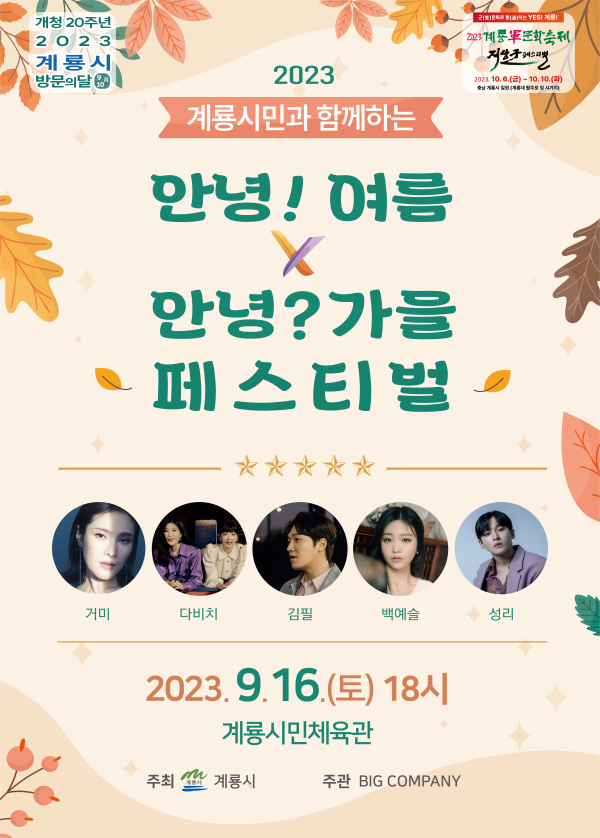 계룡시 개청 20주년과 계룡시 방문의 달을 맞아 열리는 이번 공연은 계절적 요소를 가미한 국내 정상급 가수가 출연하는 대중음악 콘서트로 계룡시민과 관람객이 함께 참여하는 축제의 장으로 준비했다.