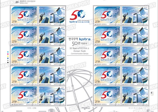 충청지방우정청(청장 장석구)은 한국 무역성장에 큰 역할을 담당해 온 KOTRA 설립 50주년을 맞아 기념우표 2종을 발행해 6월 14일부터 전국우체국에서 판매한다고 밝혔다.