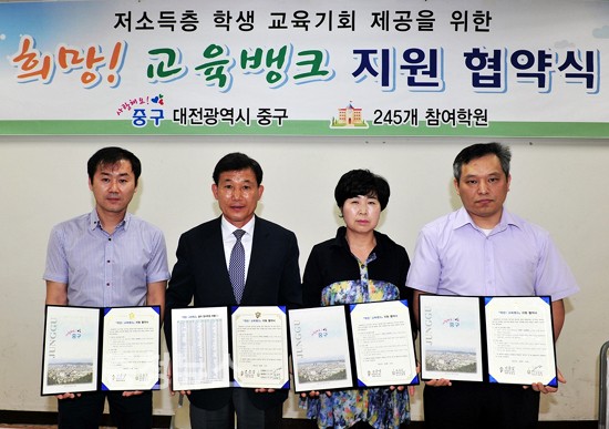 대전 중구(구청장 박용갑)는 14일, 저소득층 교육비 지원을 위해 관내 245개 학원과 '희망! 교육뱅크' 지원 협약을 체결했다.