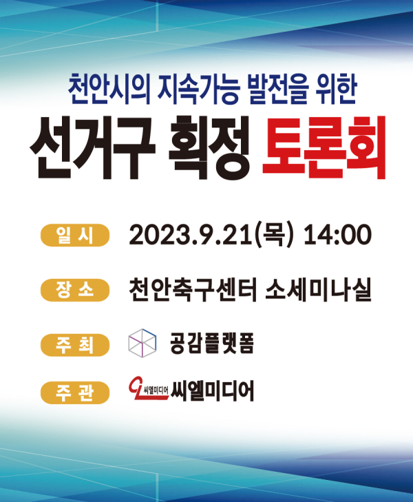 공감플랫폼이 주최하고 씨엘미디어가 주관하는 이번 토론회는 내년 4월 실시되는 제22대 국회의원 선거에서 천안지역 선거구 조정이 필요함에 따라 각 당의 이해관계를 모아 지속 가능한 선거구 획정을 도출하기 위해 마련됐다.