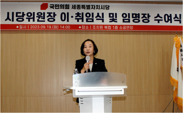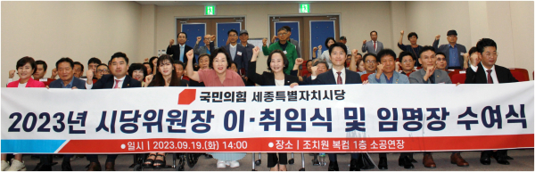 [충청뉴스 최형순 기자] 국민의힘 세종특별자치시당(위원장 송아영)은 19일 조치원 복컴 1층 소공연장에서 시당위원장 이·취임식 및 주요 당직자 임명장 수여식을 개최했다.
