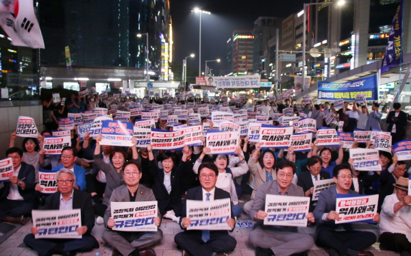 이날 오후 7시 둔산동 국민은행 앞에서 열린 규탄대회에는 황운하 시당위원장과 박범계(서구 을)·장철민(동구)국회의원과 허태정 전 대전시장, 황인호(동구)·장종태(서구)·박정현(대덕구) 전 구청장을 비롯 시민과 당원 500여 명이 참석, 윤석열 정권을 규탄했다.
