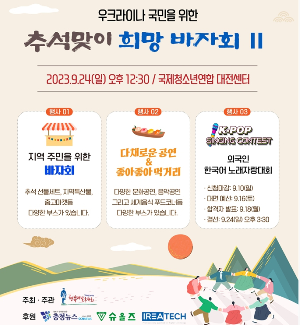 [충청뉴스 최형순 기자] 행복배달후원회는 오는 24일 오후 12시 30분 국제청소년연합 대전센터에서 우크라이나 국민을 위한 ‘추석맞이 희망 바자회’를 개최한다.