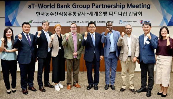 한국농수산식품유통공사 김춘진 사장(우측 5번째), 크리스토퍼 브렛(Christopher Brett) 세계은행(World Bank) 농업환경국장(좌측 5번째)