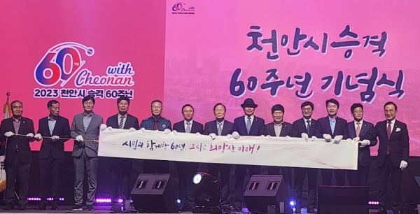 천안시는 23일 천안종합운동장 오륜문 광장에서 ‘시민과 함께한 60년, 그리고 희망찬 미래!’를 주제로 기념행사를 열고, 60년간의 눈부신 성장과 발전을 축하하며 희망찬 새로운 미래를 제시했다.