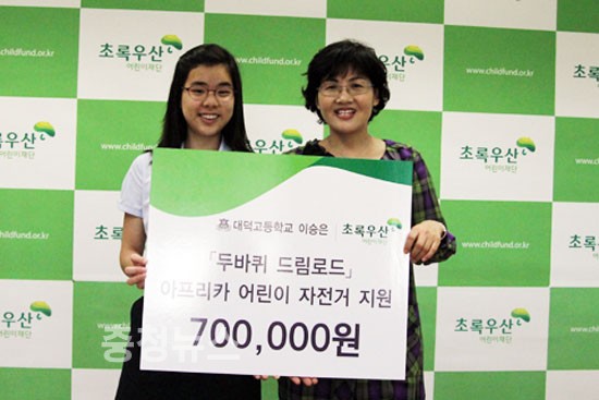 대전 대덕고등학교 1학년 이승은 학생은 20일 초록우산 어린이재단 대전지역본부를 방문해 아프리카 아동 자전거 지원 캠페인 ‘두 바퀴의 드림로드’ 후원금으로 70만원을 전달했다.