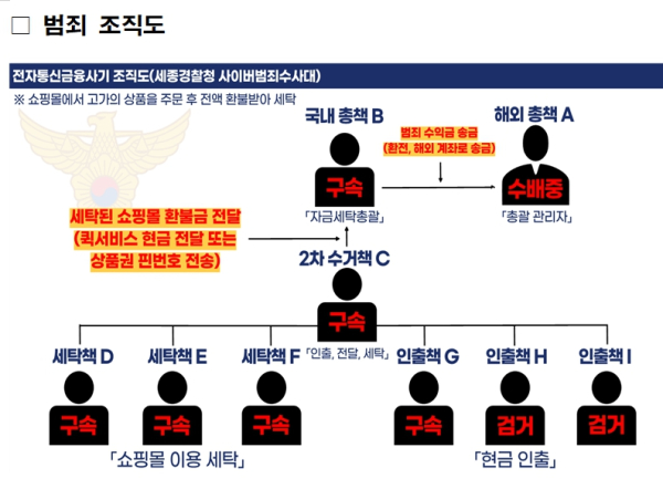 [충청뉴스 최형순 기자] 세종경찰청(청장 손장목)은, 온라인 쇼핑몰의 가상계좌 결제서비스를 악용하여 피해금을 자금 세탁하는 신종수법으로 국내 총책 등 11명을 검거하였다.(6명 구속)