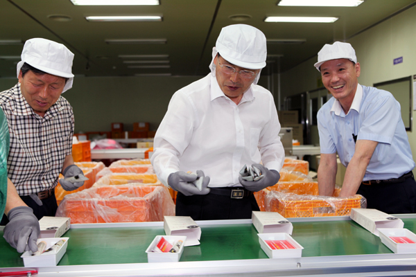 박 군수는 한방샴푸 제품생산라인 견학과 함께 생산제품 박스포장 체험에 나서 생산라인 직원들에게서 현장의 어려움을 청취하고 나름의 해법을 제시하는 등 진솔한 대화를 나눴다.