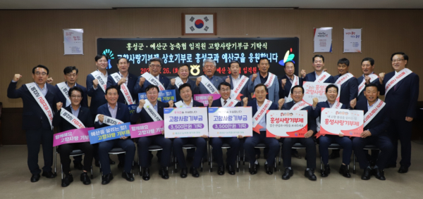 먼저 이용록 홍성군수, 최재구 예산군수, 이종욱 농협충남세종본부장, 홍성군·예산군 지역 농축협조합장 등 30여 명이 참여해 ‘홍성·예산 농축협 임직원 고향사랑기부금 상호기탁식’을 갖고 고향사랑기부제 확산을 위해 지자체와 농협이 함께 노력하기로 했다.