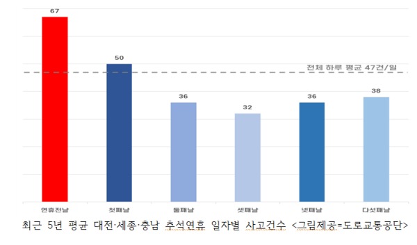 [충청뉴스 김용우 기자] 도로교통공단 대전·세종·충남지부(지역본부장 나재필)는 대전·세종·충남지역의 최근 5년간(2018~2022년) 추석연휴 교통사고 통계를 분석한 결과, 연휴 전날 교통사고가 가장 많은 것으로 나타났다고 밝혔다.