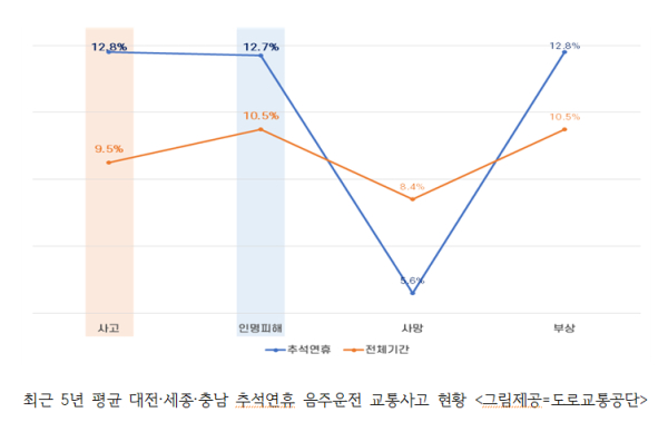 추석 연휴에 대전·세종·충남지역의 음주운전으로 인한 교통사고 비율도 12.8%로 5년 평균(9.5%)보다 34.7% 높았으며, 그 중 세종(33.3%, 대전 10.8%, 충남 14.3%)이 가장 높았다.