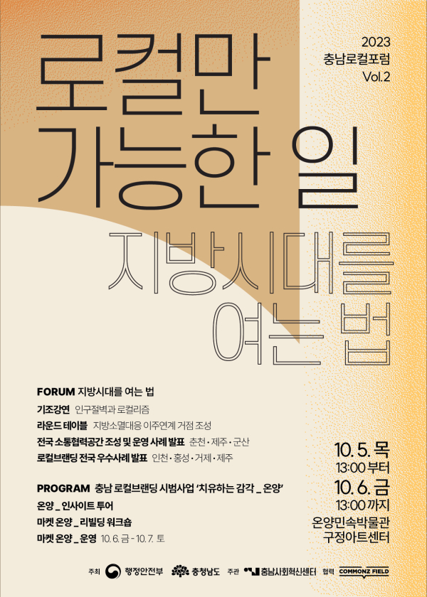 이번 충남로컬포럼은 충남형 소통·협력 거점 기반 로컬브랜딩 시범사업이 동시에 진행된다. ‘치유와 회복의 온양’을 주제로 ‘치유하는 음악’, ‘회복하는 몸’과 관련된 퍼포먼스가 연계되며, 새로운 마켓문화를 선보이는 리빌딩 워크숍과 온양마켓 등 다양한 로컬브랜딩 쇼케이스 행사가 진행된다.