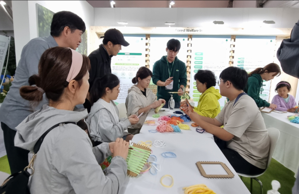9월 30일에서 10월 1일 추석 연휴 기간 강원 세계산림엑스포 한국산림복지진흥원 홍보부스에서 업사이클 컵받침 만들기 프로그램에 참가한 가족이 국립산림치유원 직원의 설명을 듣고 있다.