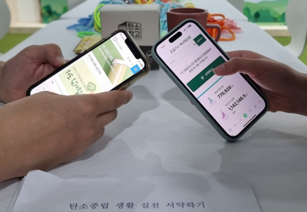 지난 9월 30일에서 10월 1일 추석 연휴 기간 강원 세계산림엑스포 한국산림복지진흥원 홍보부스에서 프로그램 참가자가 한국기후·환경네트워크 누리집(https://www.kcen.kr)에 접속해 탄소중립 생활 실천 서약을 하고 있다.