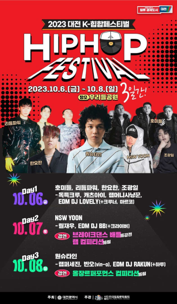 2023 대전 K-힙합페스티벌은 6일~8일 중구 대흥동 우리들공원에서 ▲6일 캣츠아이, 사운드돔, 랩퍼 세진, 한요한, 조광일, 리듬파워, 호미들, EDM파티 ▲7일 브레이크댄스 배틀 (16강~결승), NSW YOON, 랩머니사냥꾼 축하공연, EDM파티 ▲8일 올장르 퍼포먼스 경연대회, 릴재우, 원슈타인 축하공연, EDM파티 등 다채로운 힙합뮤직페스티벌 야외콘서트로 진행한다.