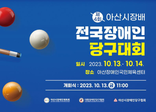 [충청뉴스 박동혁 기자] 아산시장애인체육회는 오는 13~14일 아산장애인국민체육센터에서 ‘제4회 아산시장배 전국장애인당구대회’를 개최한다고 12일 밝혔다.