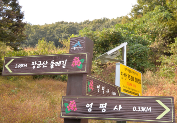 장군산을 오르는 주요 등산로는 세종 방면 영평사, 금암리와 한국영상대학교(웅진관), 은용리 들머리가 있고, 공주 방면 청벽대교, 동현동, 석장리 들머리가 있다. 고즈넉한 산사의 풍경과 함께 즐길 수 있는 영평사 산행코스를 추천한다.