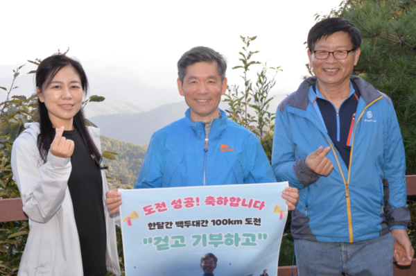 장군산 정상에서 전날 이은수 회원이 초록우산 프로젝트 ‘걷고 기부하고’ 백두대간 100km 도전 성공을 축하하는 자리도 함께 마련했다.