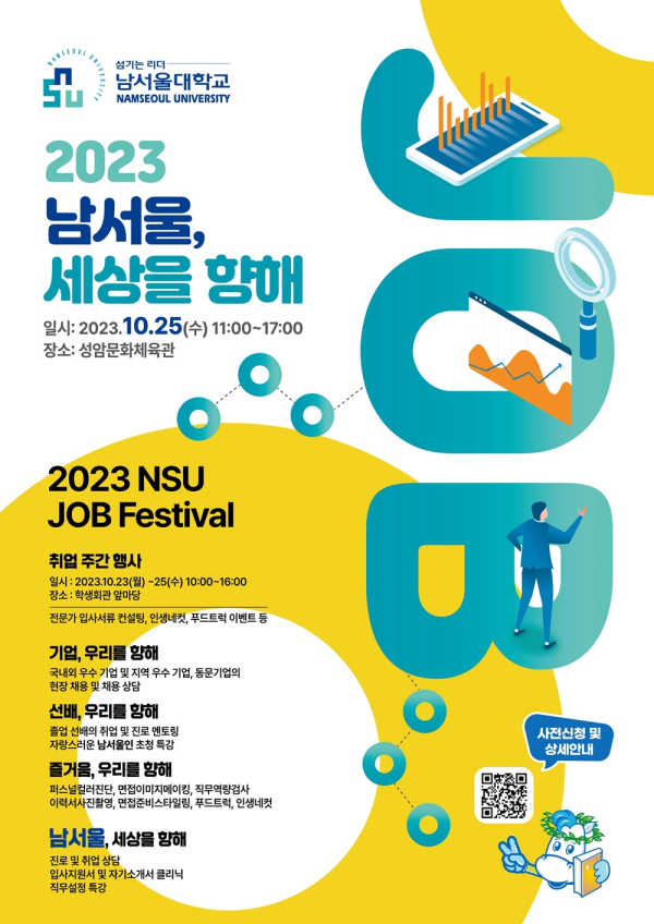 [충청뉴스 박동혁 기자] 남서울대학교는 오는 25일 성암문화체육관에서 취업에 관한 모든 정보를 제공하는 ‘2023 NSU JOB Festival’을 개최한다고 18일 밝혔다.