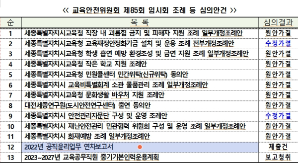 세종시의회 교안위, 시교육청 민원콜센터 민간위탁 동의안 등 의결