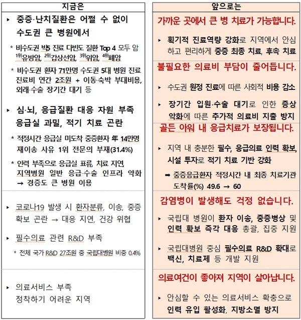 우선 수도권 대형병원에 가지 않더라도 지역에서 중증·응급 최종 치료가 완결되도록 국립대병원 등 거점기관의 의료역량을 강화할 계획이다.
