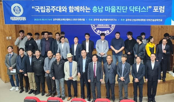 [충청뉴스 최형순 기자] 국립 공주대학교(예산캠퍼스) 산업과학대학원 지역건설공학전공 교수들과 학생들이 중심이 되어 만들어진 ‘충남마을닥터연구소’(소장 정남수 교수)는 18일 본관 컨벤션홀에서 ‘충남 마을진단 닥터스 포럼’을 개최하였다.