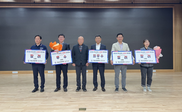 2023년 자위소방대 소방훈련 경진대회 수상팀(왼쪽부터 ㈜비츠로셀, 한국중부발전 신보령발전본부, 한국서부발전 태안발전본부, 한화갤러리아 ㈜센터시티, CJ대한통운 목전첨)