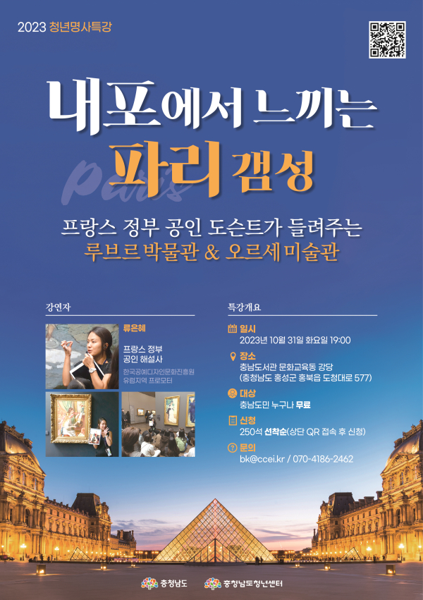 [충청뉴스 권상재 기자] 충남도는 31일 충남도서관 문화교육동 대강당에서 ‘내포에서 느끼는 파리 갬성’을 주제로 서양미술사 특강을 진행한다고 30일 밝혔다.