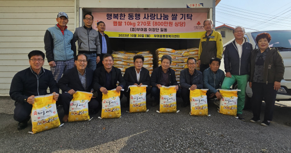 [충청뉴스 부여 = 조홍기 기자] 부여군 부여읍 이장단(회장 이광열 등 53인)은 지난 30일 사랑 나눔 쌀 10kg, 270포(시가 800만원 상당)를 부여읍 행정복지센터에 기탁했다.
