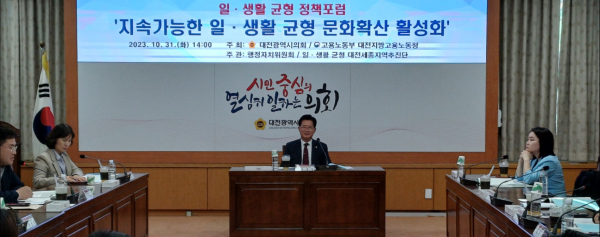 이재경 대전시의회 행정자치위원장(국민의힘 서구 3)은 31일 대전시의회 3층 소통실에서 기업관계자와 대전세종연구원, 시민단체 회원 등 70명이 참여한 가운데 지속가능한 일생활균형 문화확산 활성화를 위한 일생활균형 정책포럼(이하 포럼)을 개최했다.