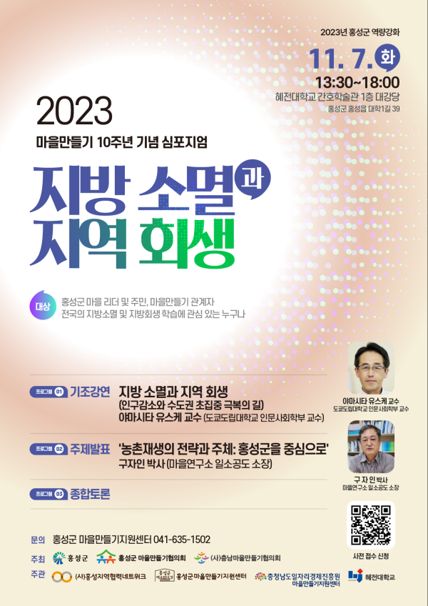 자세한 문의 사항은 홍성군 마을만들기지원센터(041-635-1502)로 문의하면 되고, 참가 신청은 포스터의 QR코드로도 할 수 있다.