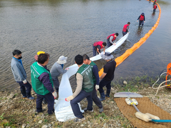 이날 훈련은 시군, 기업, 유관기관 관계자 등 180여 명이 참석한 가운데, 공주시 사곡면 호계리 부근 태화교에서 교통사고로 전복된 유조차에서 경유 300ℓ가 유구천으로 유입돼 수질오염이 발생한 상황을 가정해 실시했다.