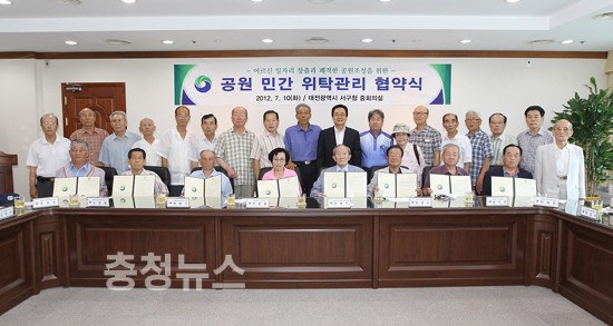 대전광역시 서구(구청장 박환용)는 안전하고 쾌적한 어린이공원 환경 조성을 위해 관내 25개 경로당과 ‘공원관리 민간위탁 협약’을 서구청 중회의실에서 체결했다.