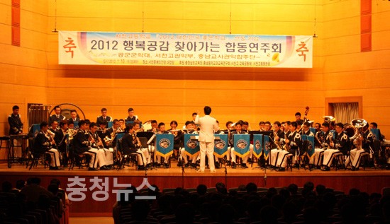 충남교육청(교육감 김종성)은 10일 오후 7시 서천 문예의전당 대강당에서 충남교사관악합주단과 공군군악대, 서천고 관악부가 함께하는 ‘2012 행복공감 찾아가는 합동 연주회’를 개최했다.