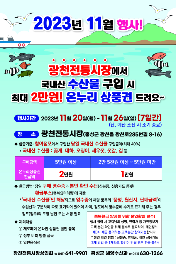 [충청뉴스 권상재 기자] 홍성군이 해양수산부가 주관하는 ‘2023년 11월 수산물 온누리상품권 환급행사’ 대상으로 광천전통시장이 선정되어 소비가 위축된 수산물 시장을 활성화하기 위해 온누리상품권 환급행사를 진행한다고 19일 밝혔다.
