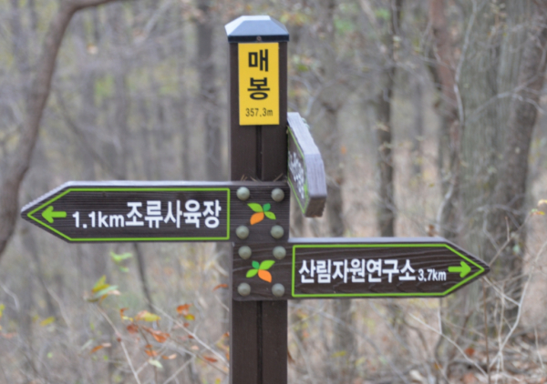 드디어 해발 357m의 매봉에 도착한다. 찬바람이 불기 시작하더니 추위가 엄습한다. 매봉 정상 이정목에서 인증사진을 찍고 곧바로 청벽 방향으로 이동한다.